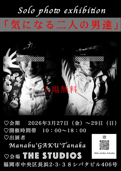 2026.3/27(金)より、写真展『気になる二人の男達』が開催されます。(☆入場無料☆マンゾ在廊日は下記ご参照☆)こちらはフォトグラファーManabu’GAKU’Tanakaさんの個展となります。今回、その被写体の内の一人として起用して頂きました。撮影者、また被撮影者、それぞれが共に同じ高みを目指した時に到達する境地。正に、1+1が3にも4にもなる事を実感した瞬間を切り取った写真の数々。是非ご覧頂きたい写真展でございます。今展示会に合わせて、会場である【THE STUDIOS】様とマンゾ画のコラボTシャツを製作しました。当日、会場にてお求め頂けますのでお気軽にお声掛け下さいませ♪∞∞∞∞∞∞∞∞∞∞∞∞∞∞∞∞∞∞∞∞∞∞∞∞∞∞∞∞∞∞写真展『気になる二人の男達』【会期】2026.3/27(金)→29(日)(※マンゾは28(土)・29(日)の二日間のみ在廊致します)【開催時間】10:00~18:00【会場】THE STUDIOS(福岡市中央区長浜2‐3‐38 シバタビル406号室)※福岡市地下鉄「赤坂駅」より徒歩約8分
