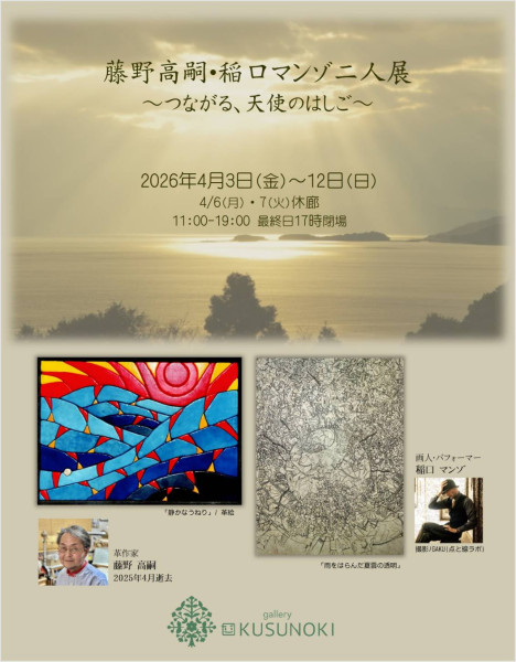 絵画二人展『藤野高嗣・稲口 マンゾ二人展~つながる、天使のはしご~』(入場無料☆マンゾ在廊☆)4/3(金)より故・藤野高嗣さんとの二人展を開催致します。ちょうど一年程前、二人展の企画を進めていた最中に藤野さんが急逝なされました。その少し前、海岸沿いに停めた車の中で、ご自身の命がいつ尽きてもおかしくない事を話して下さいました。だから今、開催したいのだ、と。いつもと変わらぬ優しい口調と微笑みで。会場は僕達が大好きな『gallery KUSUNOKI』に決めるべく、すぐに藤野さんご自身が連絡を取り話しを進めて下さいました。その最中の訃報。その藤野さんの思いを実現すべく、この度『gallery KUSUNOKI』様が今展示会を企画して下さいました。「いや~嬉しいですよ♪ははは、すみません」と藤野さんの声が聞こえるよう。皆様もどうぞ笑顔でお気軽に遊びにお越し下さいませ。(同敷地内の『Cafe & kitchen KUSUKUSU』にて美味しいお茶やお食事もお楽しみ頂けます)末文になりましたが『gallery KUSUNOKI』様、『Cafe & kitchen KUSUKUSU』様によるこの度のご厚意に、二人より心からの感謝を申し上げます。誠にありがとうございます。∞∞∞∞∞∞∞∞∞∞∞∞∞∞∞∞∞∞絵画二人展『藤野高嗣・稲口 マンゾ二人展~つながる、天使のはしご~』(入場無料☆マンゾ在廊☆)【会期】2026.4/3(金)→12(日)(※休廊4/6(月)・7(火))【時間】11:00→19:00※最終日は17:00まで【場所】gallery KUSUNOKI(福岡市中央区赤坂3丁目6の37)